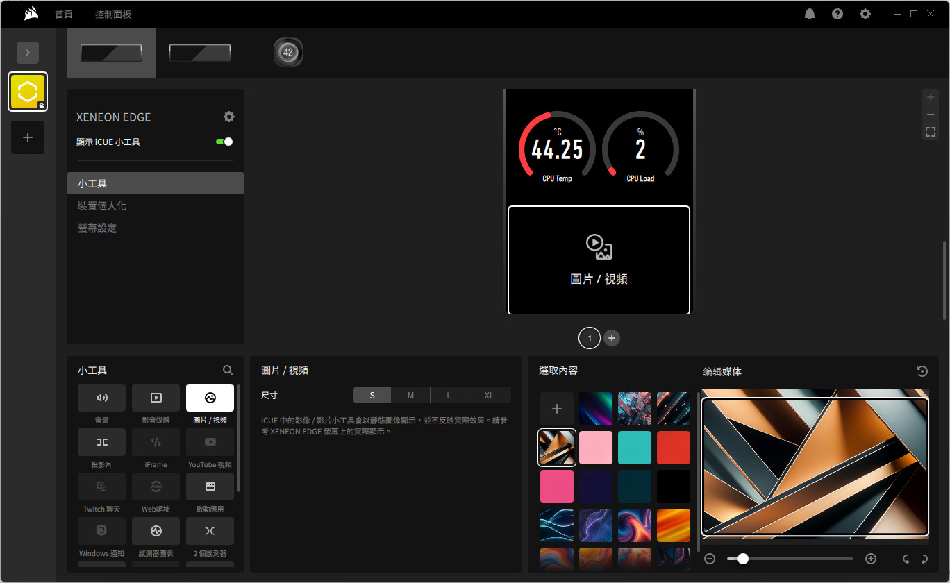 iCUE 設定頁面中只要打勾「顯示 iCUE 小工具」,那 XENEON EDGE 14.5″ LCD 就會強制顯示軟體的小工具畫面。iCUE 提供非常多小工具像是呈現照片 / 影片、輪播、iFrame、啟動 App、Twitch 聊天室、YT 影片、監控資訊、音效控制、多媒體控制、時鐘、系統通知、Web URL 等。