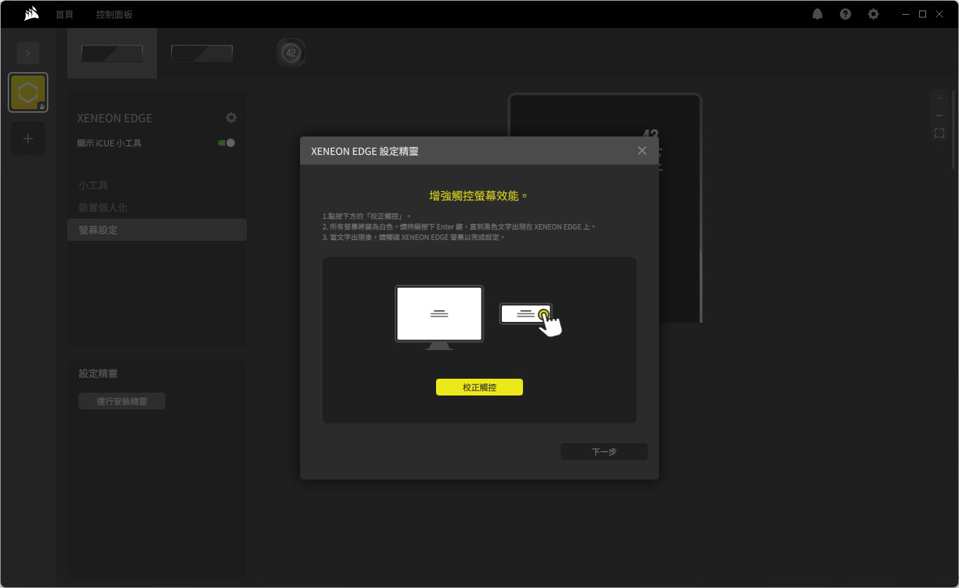 觸控功能要先透過螢幕設定來校準,按下「校正觸控」按鈕後,依照操作讓系統將觸控指令對應到正確的 XENEON EDGE 螢幕即可。
