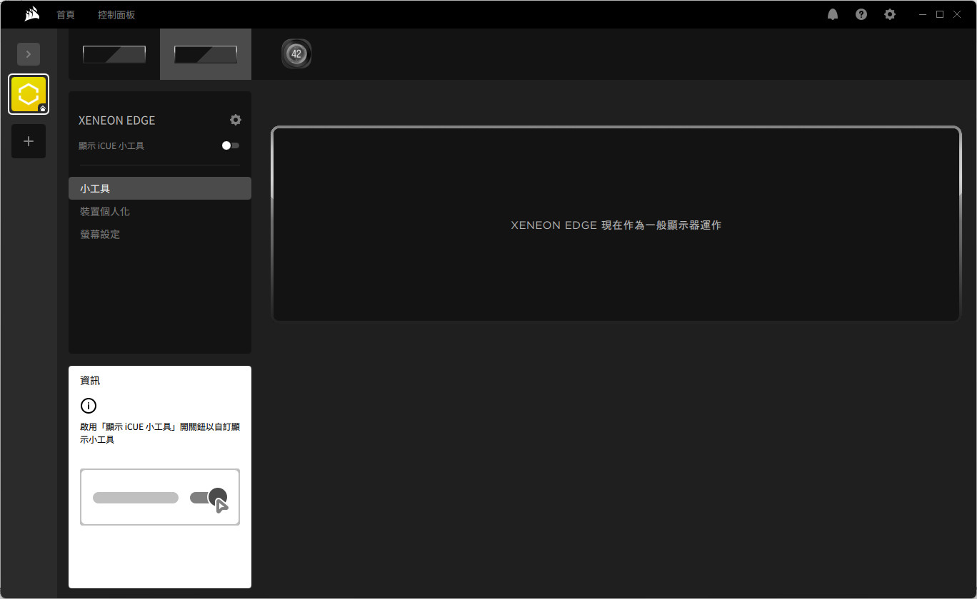 XENEON EDGE 14.5 吋 LCD 的使用也相當容易,連接至電腦後就如同一般螢幕一樣,可直接在系統調整解析度、雙螢幕排列等;安裝 iCUE 軟體後,通過軟體可以校正螢幕的觸控功能,並有著直覺的開關可以切換「顯示 iCUE 小工具」或做為一般螢幕使用。