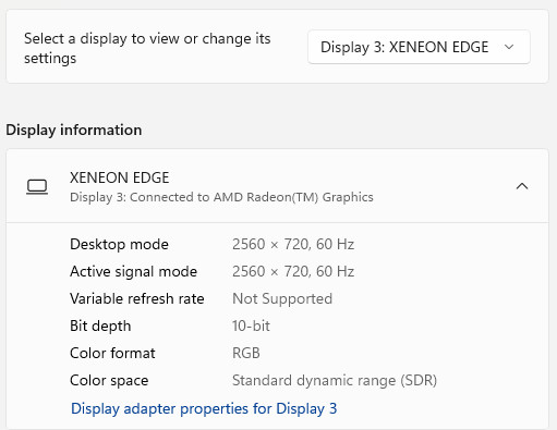 XENEON EDGE 14.5″ LCD 連接上電腦就如同一般螢幕一樣,可在系統、顯示器設定中調整位置,而螢幕的規格為 2560 x 720、10-bit、RGB、SDR、60Hz 的規格。