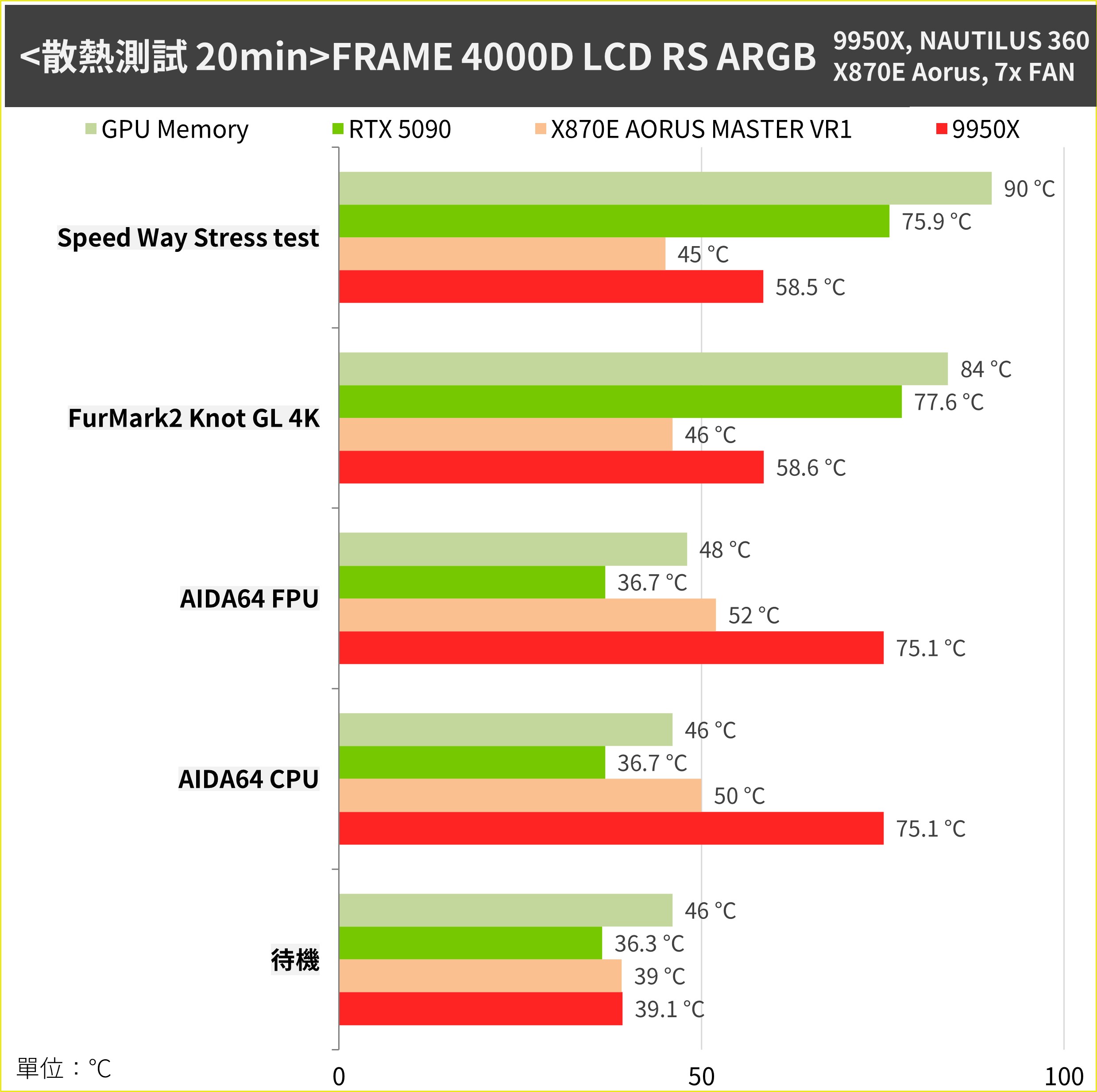 散熱測試,FRAME 4000D LCD RS ARGB 在待機時 9950X CPU 39.1°C、GPU 36.3°C;在 AIDA64 CPU 壓力測試下,CPU 溫度來到 75.1°C、VRM 50°C;緊接著 FPU 壓力測試下 CPU 溫度維持在 75°C、VRM 52°C;CPU 壓力測試下稍微改變 GPU 溫度但影響不大。