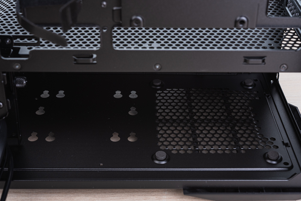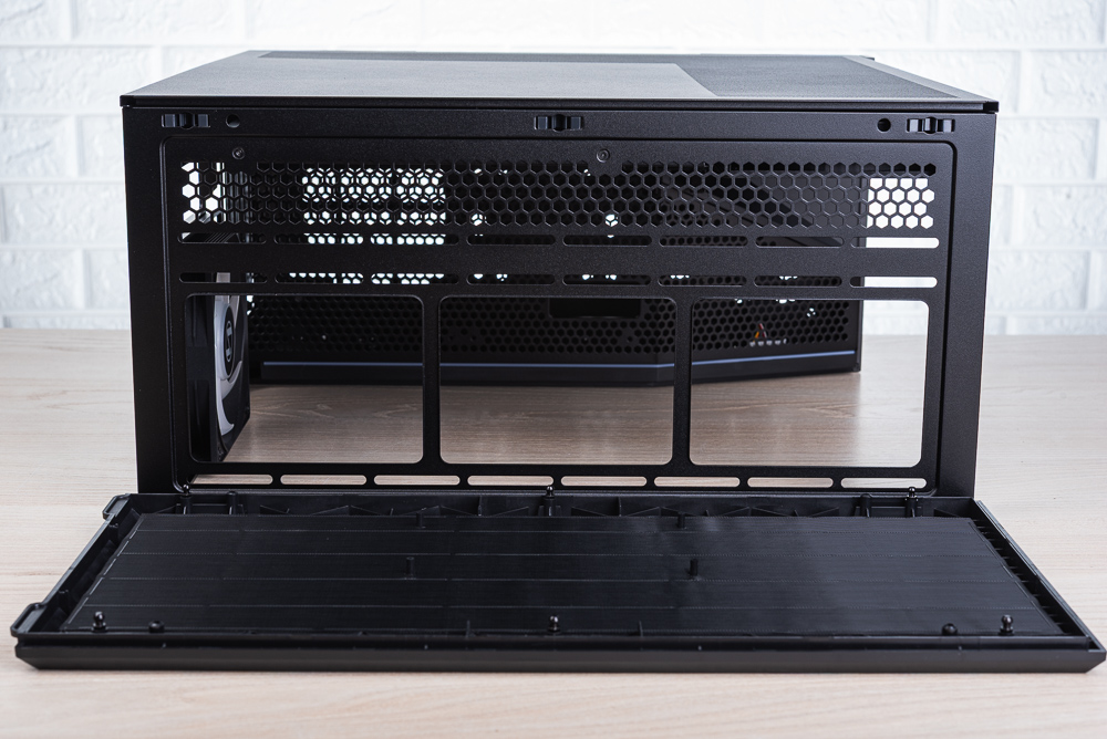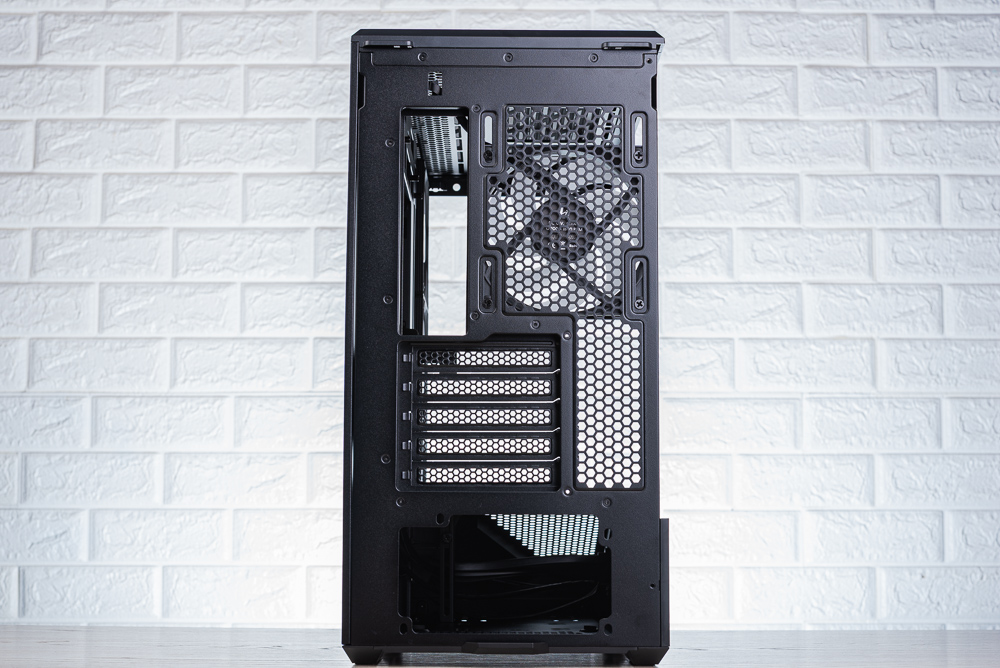 機殼右側側板則有著 L 形狀的散熱網孔,主要讓機殼側面風扇進風外,也讓機殼底部的分艙有較好的散熱開孔。至於機殼後方則是標準的上下分艙、5 槽 PCIe、底置 ATX 電供的配置。