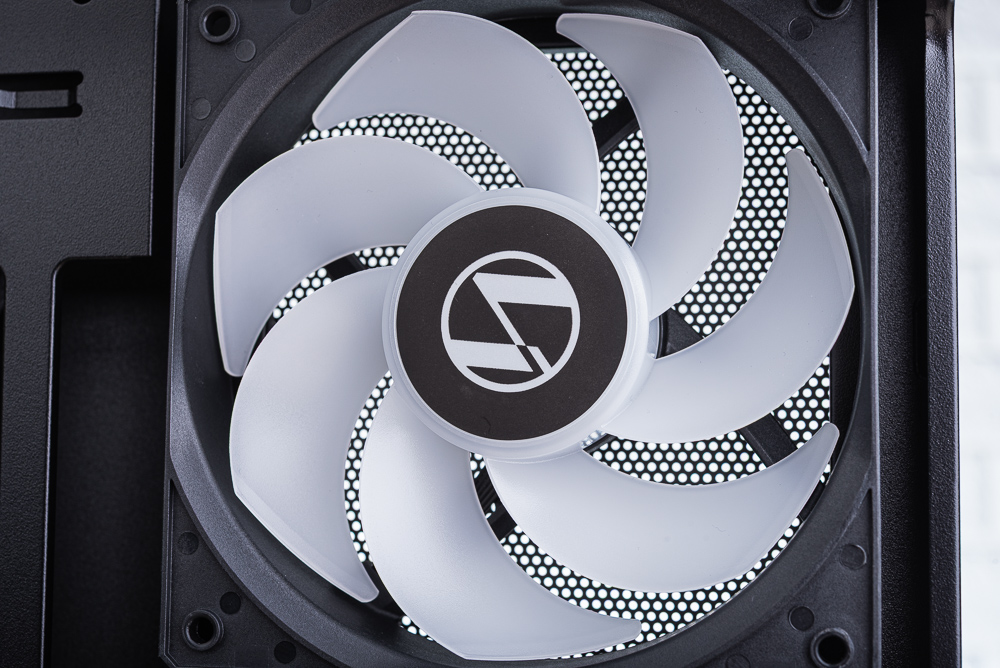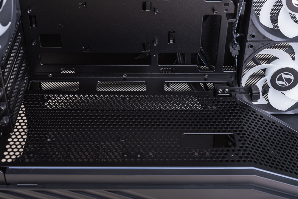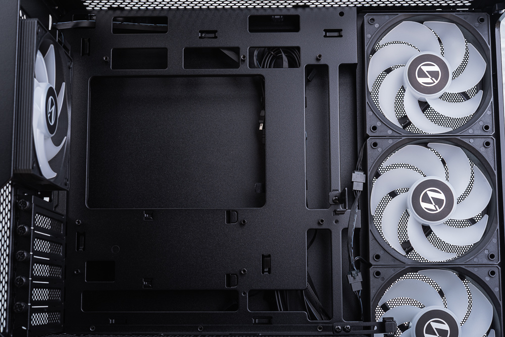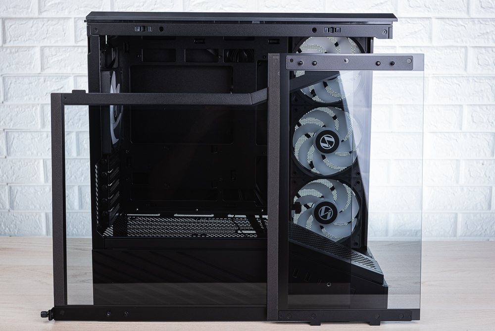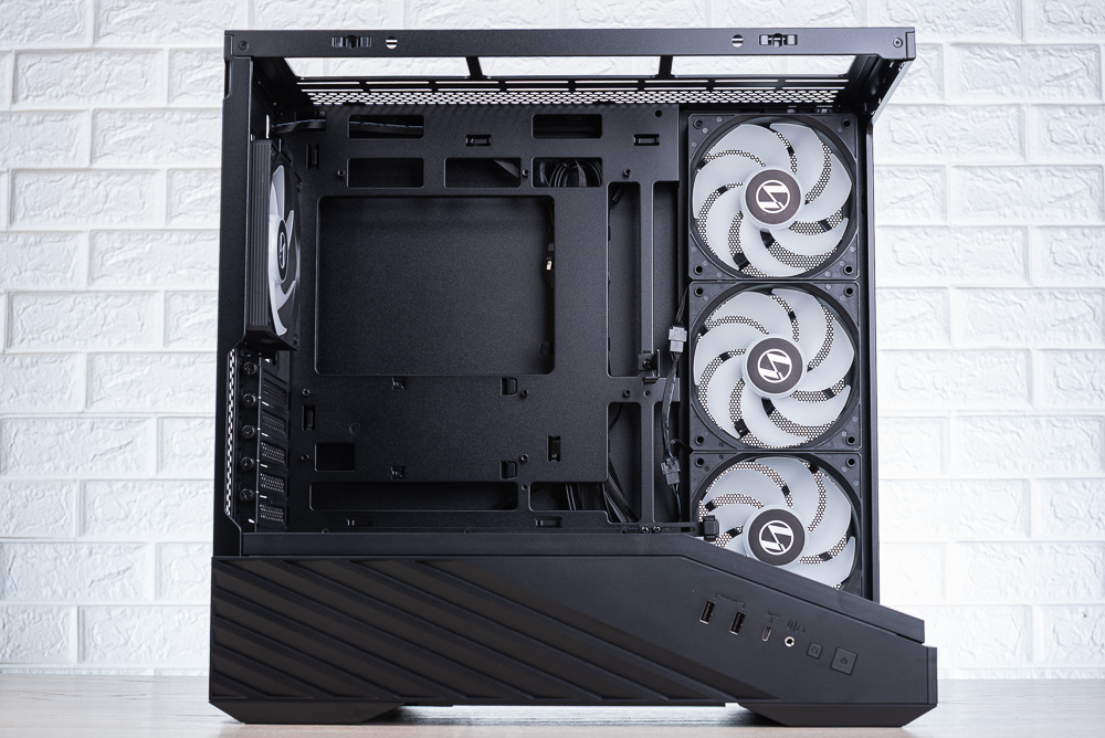 機殼內部,主機板安裝空間支援 M-ATX、Mini-ITX 與背插主板,並在主板上方、右側與下方留有相當大的走線開孔。至於機殼分艙則是全網開孔,分艙上方支援 2 顆 120mm 風扇安裝。機殼側面風扇,則使用 3 顆反向扇葉的 ARGB 120mm 風扇。