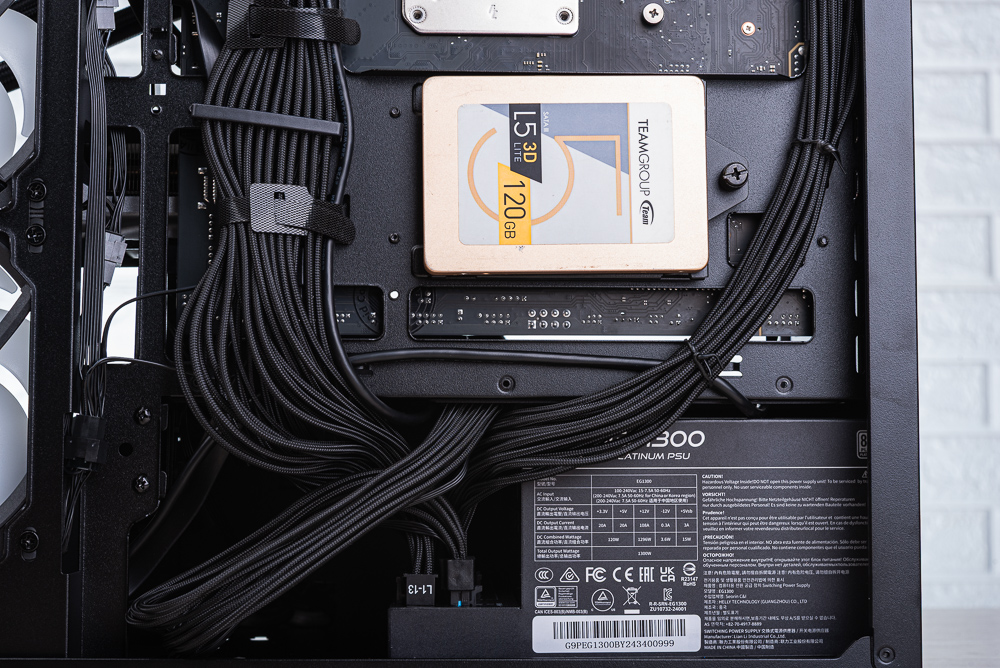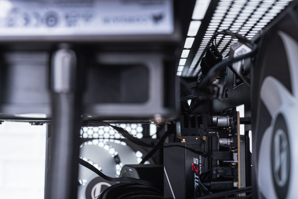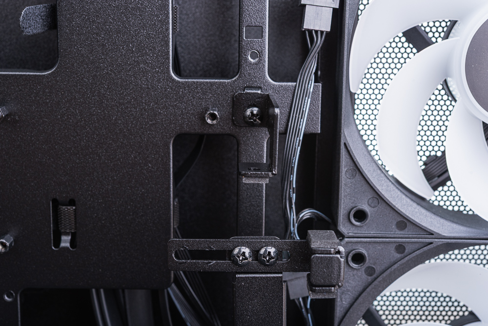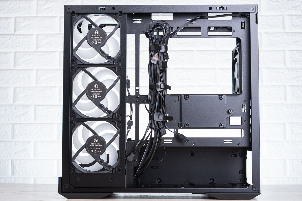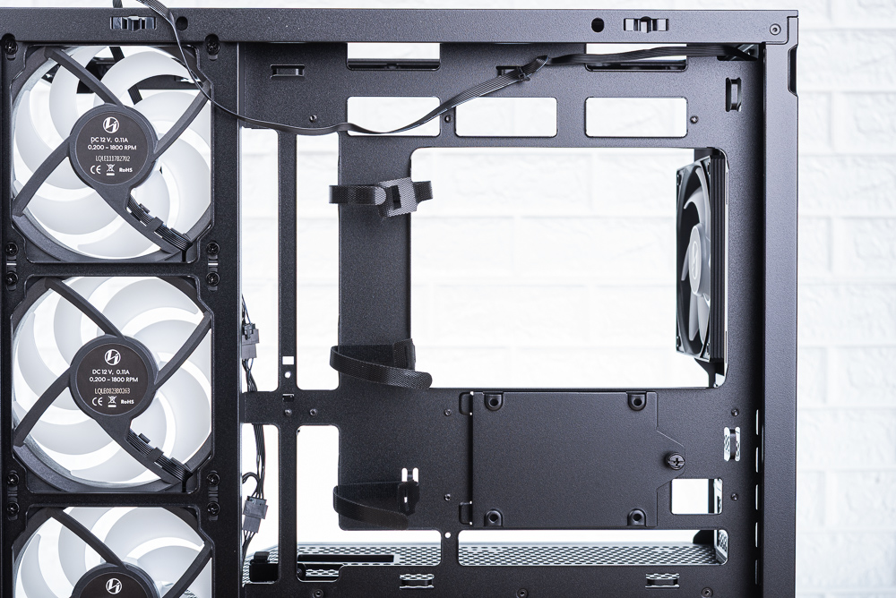 機殼右側出廠時已將 4 顆風扇的 PWM 與 RGB 互相串接且有著較好的理線,這邊玩家只需整理出機殼的 4pin PWM 與 ARGB 3pin 連接線即可。而在後方則有 3 個魔鬼氈、多個架橋,讓玩家在理線時更容易。