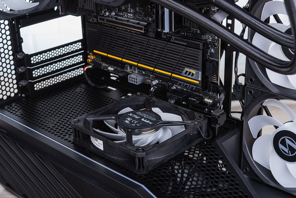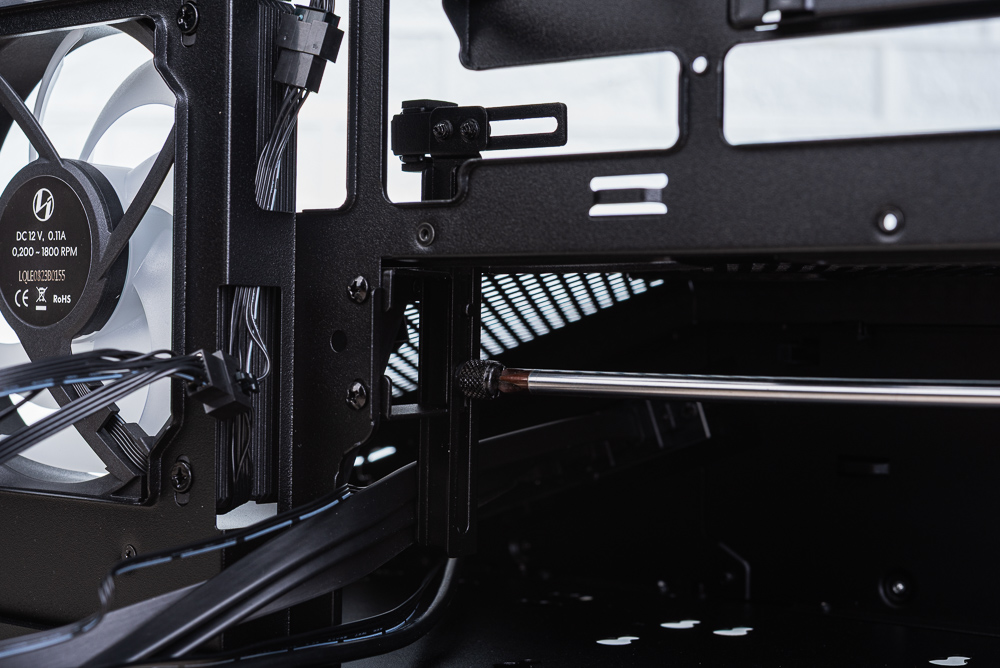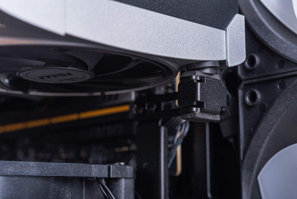 機殼分艙上方也可安裝風扇,使用配件的長牙螺絲即可固定,不過安裝風扇後會讓顯卡供電線材比較難走線。