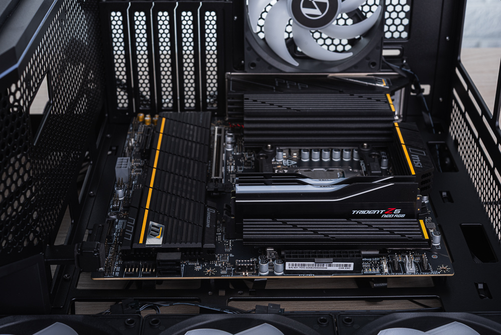 但相對的,在體積縮小的情況下,Vector V100R MINI 機殼上方安裝 360mm 水冷時,需要注意冷排 + 風扇厚度應介於 50mm 左右,像是本次安裝的水冷加風扇厚度為 52mm,安裝後冷排緊貼主板的 VRM 散熱器;此外,若玩家安裝的記憶體屬於較高的 RGB 記憶體,這也會在組裝時遇到阻礙。