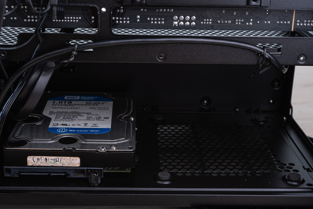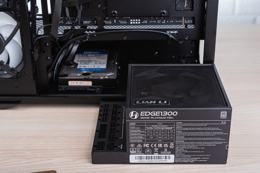 電源分艙雖說空間足夠,但建議搭配小於 150mm 長度的電供,這樣下分艙還可輕鬆安裝 3.5 吋裝置。但這次安裝使用 Lian Li Edge 較長的電供,因此玩家可挑戰機殼下分艙最前方,聯力一樣有預留安裝孔位,參考說明書步驟後一樣可安裝 3.5 吋裝置,但安裝這個位置非常刁鑽,未來要更換 HDD 也會有點小麻煩。