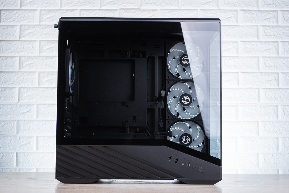 機殼左側可見下方的斜分艙讓玻璃側透也有著斜切角造型,而機殼前 I/O 則移至左側傾斜排列,提供電源開關、重開按鈕、2 個 USB 3.0、USB-C 與 3.5mm 耳機麥克風。