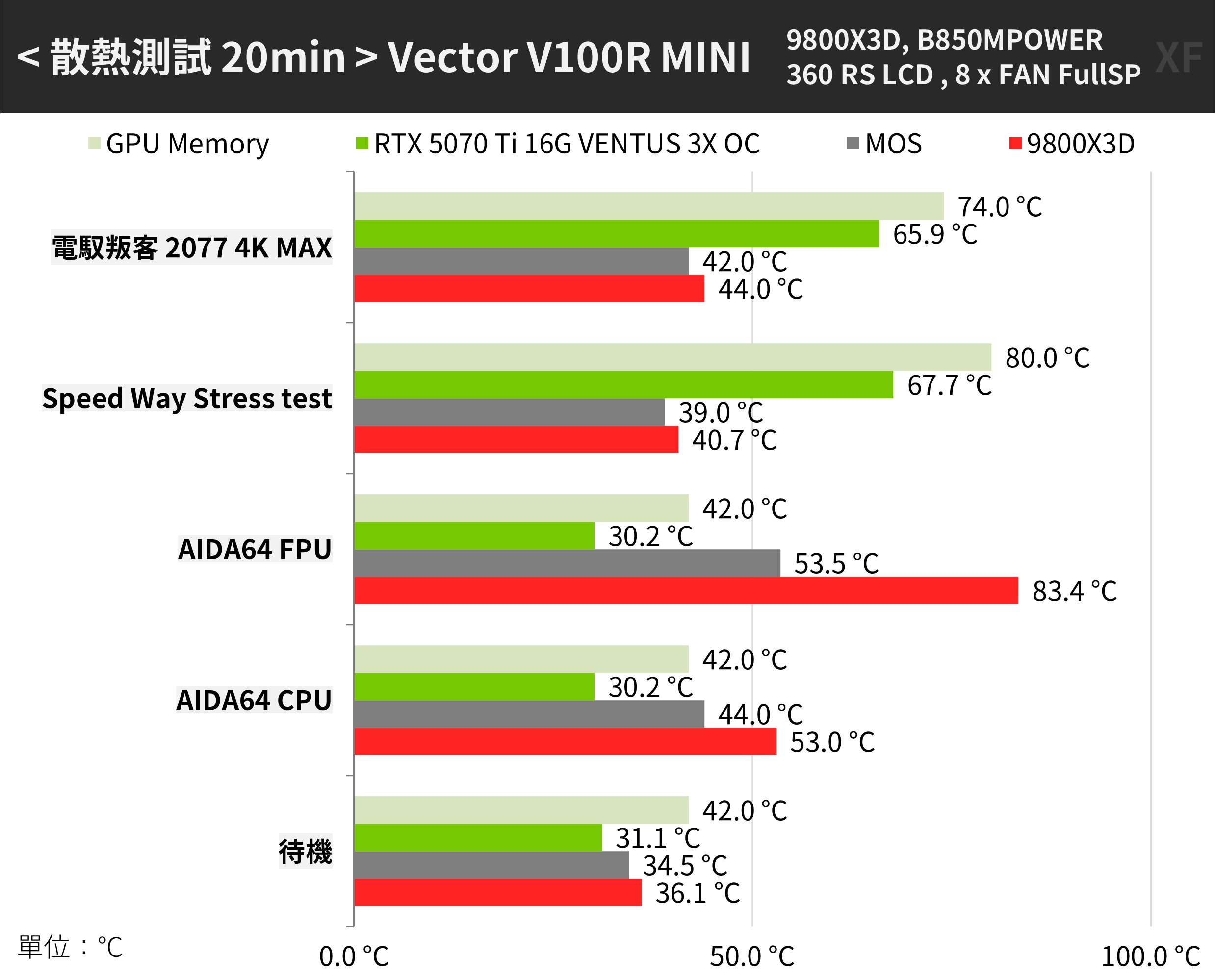 散熱測試,電腦待機時 9800X3D CPU 36.1°C、GPU 31.1°C;在 AIDA64 CPU 壓力測試下,CPU 溫度來到 53°C、MOS 44°C;緊接著 FPU 壓力測試下 CPU 溫度來到 83.4°C、MOS 53.5°C;CPU 壓力測試下 GPU 的溫度完全沒有變化。