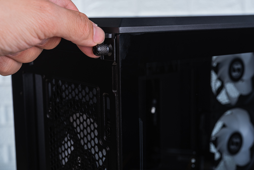 Vector V100R MINI 一樣採用快拆卡扣式的玻璃安裝,玩家可在機殼後方找到施力凹槽,將玻璃側透往外推就能取下玻璃側透,倘若不熟悉操作的玩家建議將機殼平躺後在取下玻璃。而玻璃側透在上下兩側都有金屬邊條,提供玻璃鑲嵌、卡扣等固定功能,並在另一邊貼有減震的泡棉。
