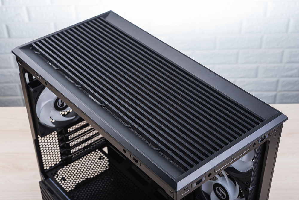 機殼上方採用快拆的頂蓋,頂蓋內部則有防塵濾網。而機殼上方可安裝 3 顆 120mm 或 2 顆 140mm 風扇,以及支援 360mm 或 240mm 水冷排安裝。由於 Vector V100R MINI 寬度也有稍微縮減,因此相對不適合安裝 280mm 水冷排。