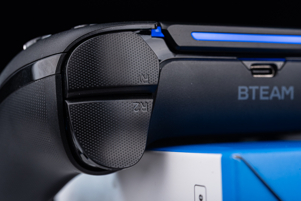 手把前方則有著藍色燈條,以及 USB-C 有線(充電)連接埠;而前方的 R1/L1 與 R2/L2 按鍵都採用細緻顆粒表面增加摩擦力,而扳機按鍵則一樣使用霍爾效應電磁感應的觸發原理。