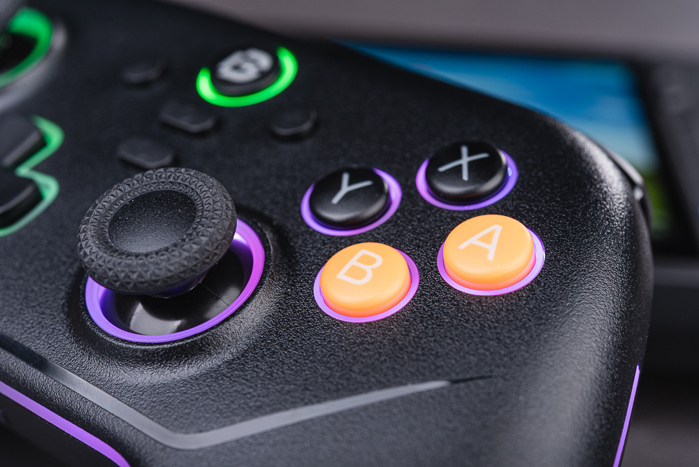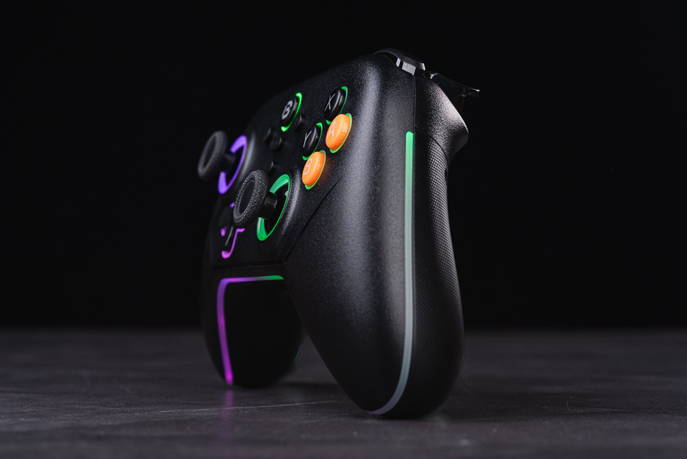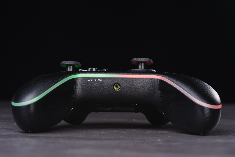 外觀上 Tizona III 躍動三代造型有點介於 Xbox 與 Switch 手把的中間,適當的人體工學尺寸 160 x 106 mm 與 280g 的重量,非常適合亞洲玩家的手掌。而手把正面採用霧面黑的處理搭配 RGB 燈效,除了正面的左搖桿、十字 DPAD、XYAB、右搖桿與 Home 按鍵都有著 RGB 燈效外,在手把的左右兩側與下方也都具備 RGB 燈條。