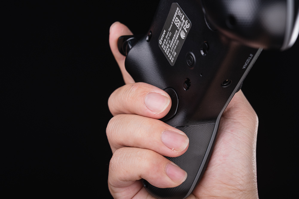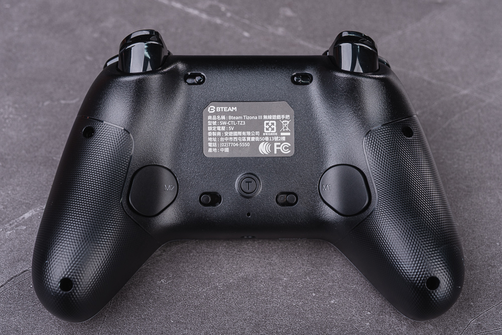 手把背面,則有著 T 連發 Turbo 按鍵,以及兩顆背鍵 M1/M2,而背鍵若不使用也具備背鍵鎖,讓玩家在握手把時不會一直誤按。此外,背面中間則是 NFC 感應區,可支援 Switch 的 Amiibo 感應。