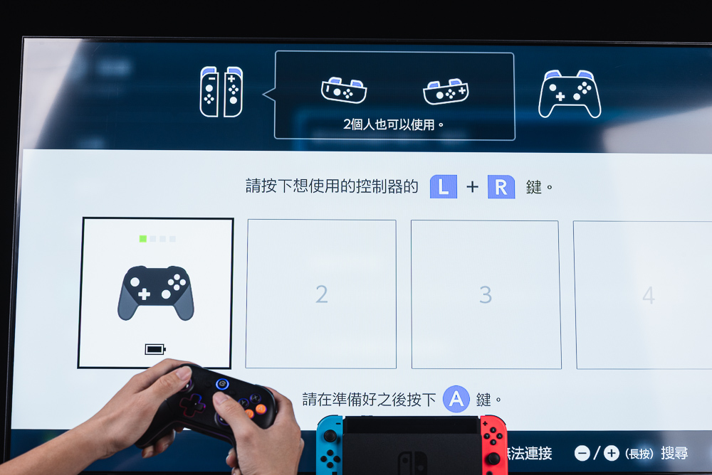 Tizona III 躍動三代預設開機為 Switch 模式,常按 Home 鍵三秒白燈閃爍,這時可在設定 > 更改控制器的拿法 / 順序中新增把手,配對成功之後即可直接使用,而且手把按下 Home 鍵也可以直接喚醒 Switch。