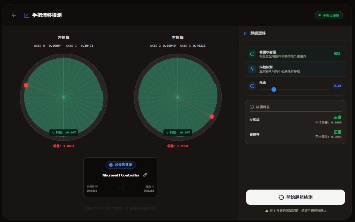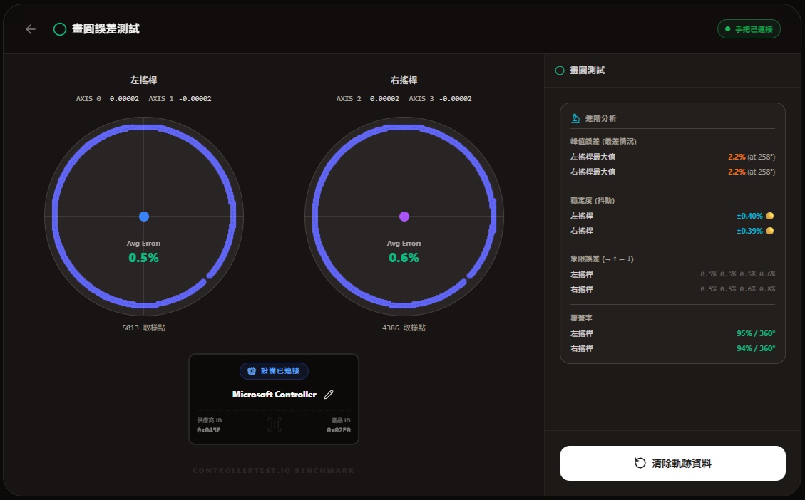 PC、手機方面,需要以 X + Home 的方式切換至藍牙配對模式,配對成功後會看到 Xbox Wireless Control。通過 Controllertest.io 測試,左右搖桿的平均 Error 約在 0.5% 無任何飄移問題,並且所有按鍵操作、震動測試都沒問題。
