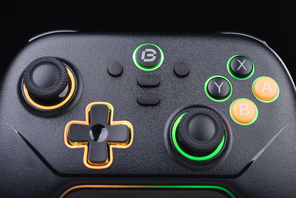 按鍵則是 XY(黑鍵)、AB(橘鍵)有著明確的按壓手感與按壓聲響;而右搖桿一樣也是霍爾效應電磁感應帶有紋路的蘑菇頭搖桿。