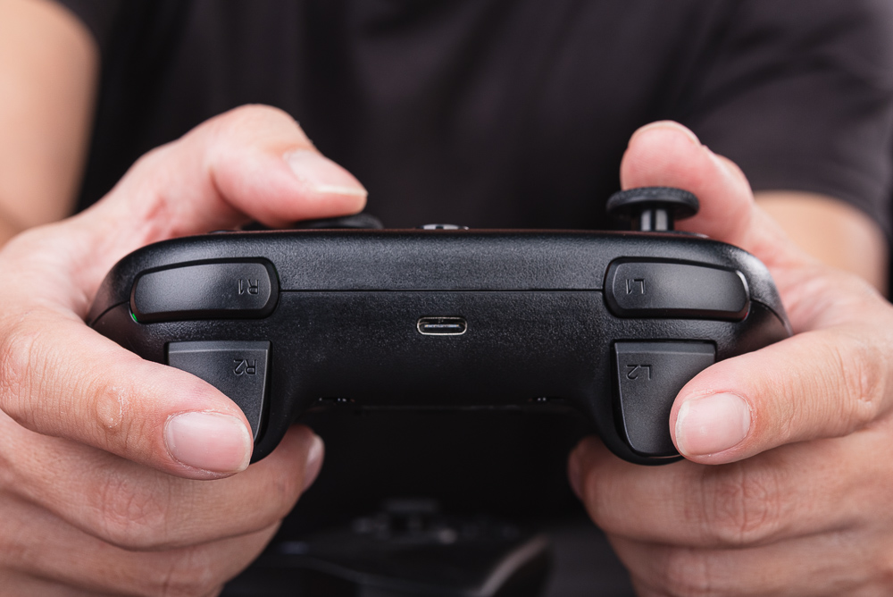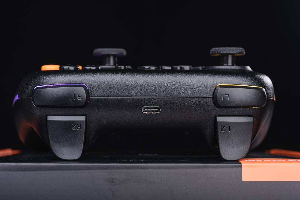 ↑ 手把前方 USB-C 與 R1/L1 按鍵、R2/L2 扳機鍵。